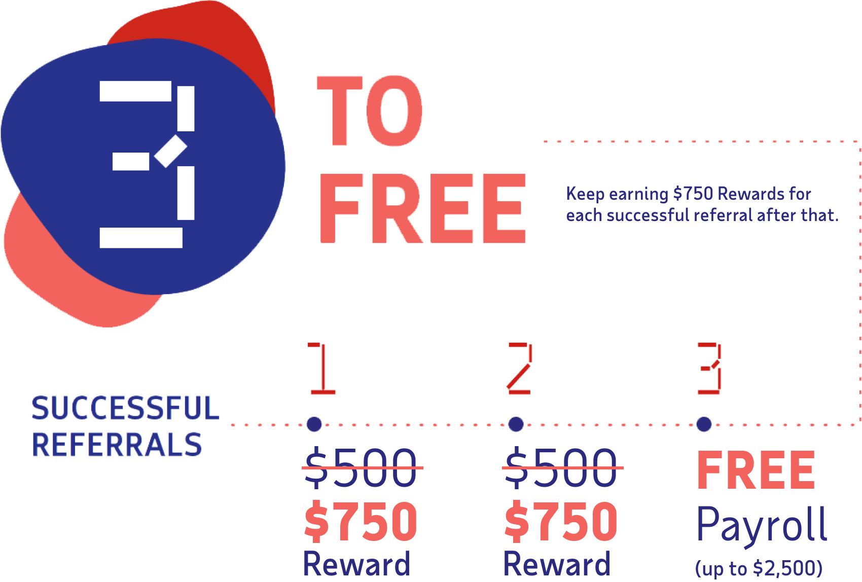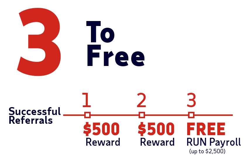 Receive $500 in rewards for each of your first two new client referrals that start payroll with ADP and then one year of free RUN Powered by ADP® payroll up to $2,500 with your third. Plus, all your referrals get three months free!*